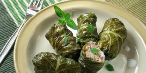 Hojas de parra rellenas de arroz, con o sin carne.