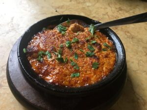 Es un plato elaborado con tomates, cebollas, pimientos rojos asados, queso feta y yogur. Es una crema untable que se sirve con pan.